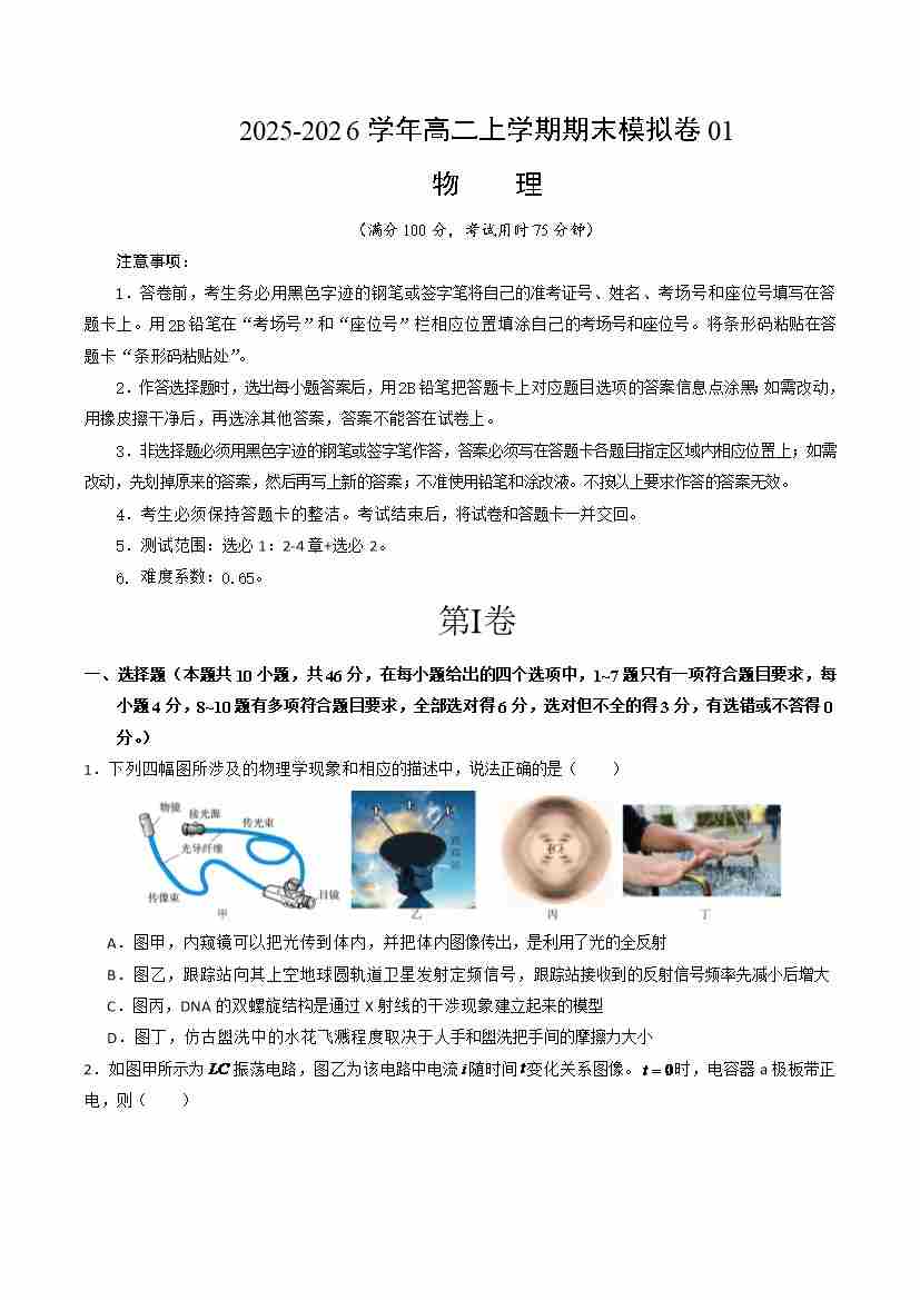 高二物理上学期期末模拟卷01(人教版2019)(考试版A4)