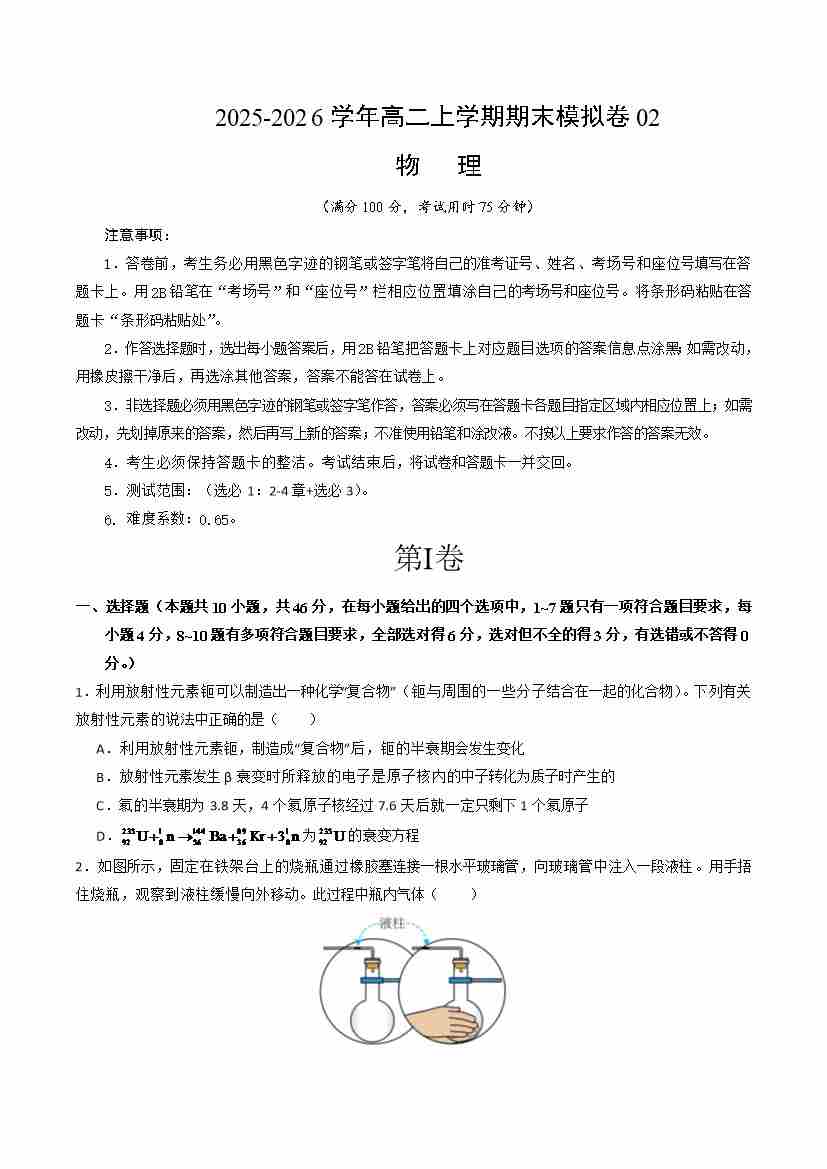 高二物理上学期期末模拟卷02(人教版2019)(考试版A4)