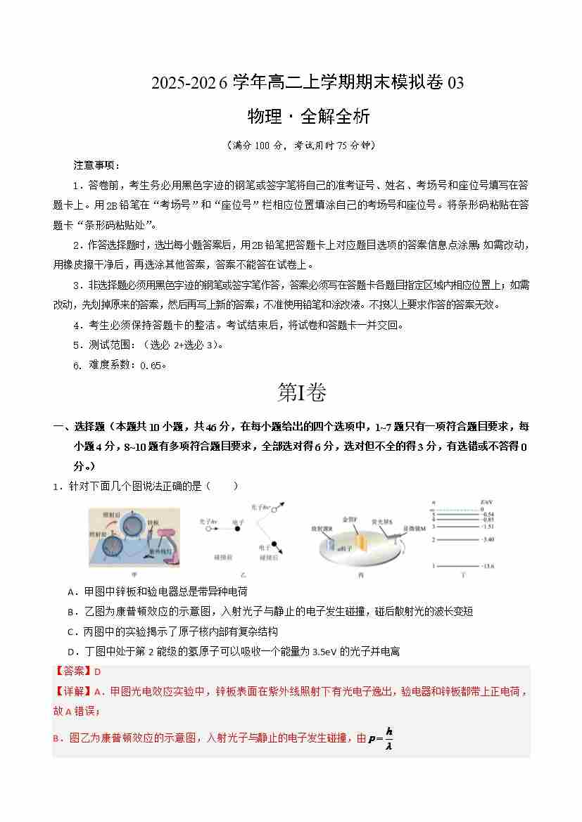 高二物理上学期期末模拟卷03(人教版2019)(全解全析)