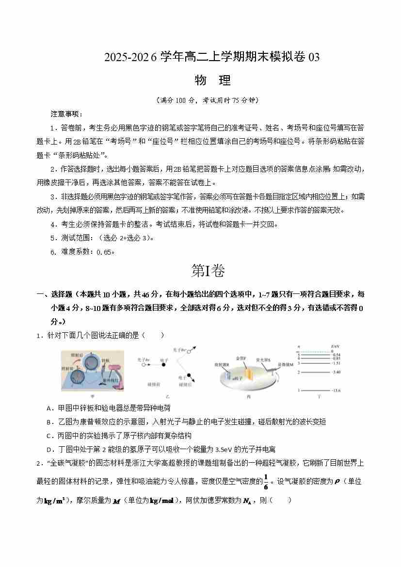 高二物理上学期期末模拟卷03(人教版2019)(考试版A4)