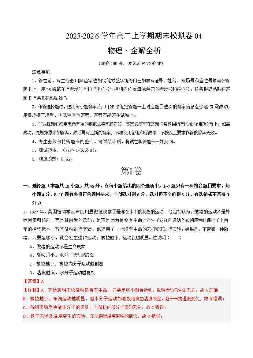 高二物理上学期期末模拟卷04(人教版2019)(全解全析)