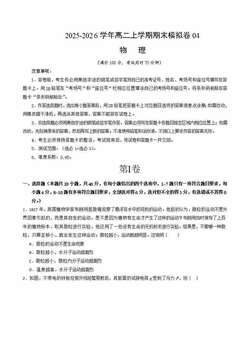 高二物理上学期期末模拟卷04(人教版2019)(考试版A4)