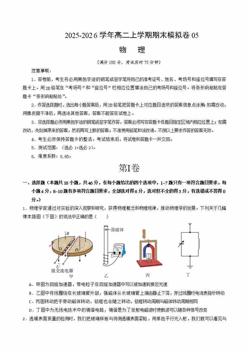 高二物理上学期期末模拟卷05(人教版2019)(考试版A4)