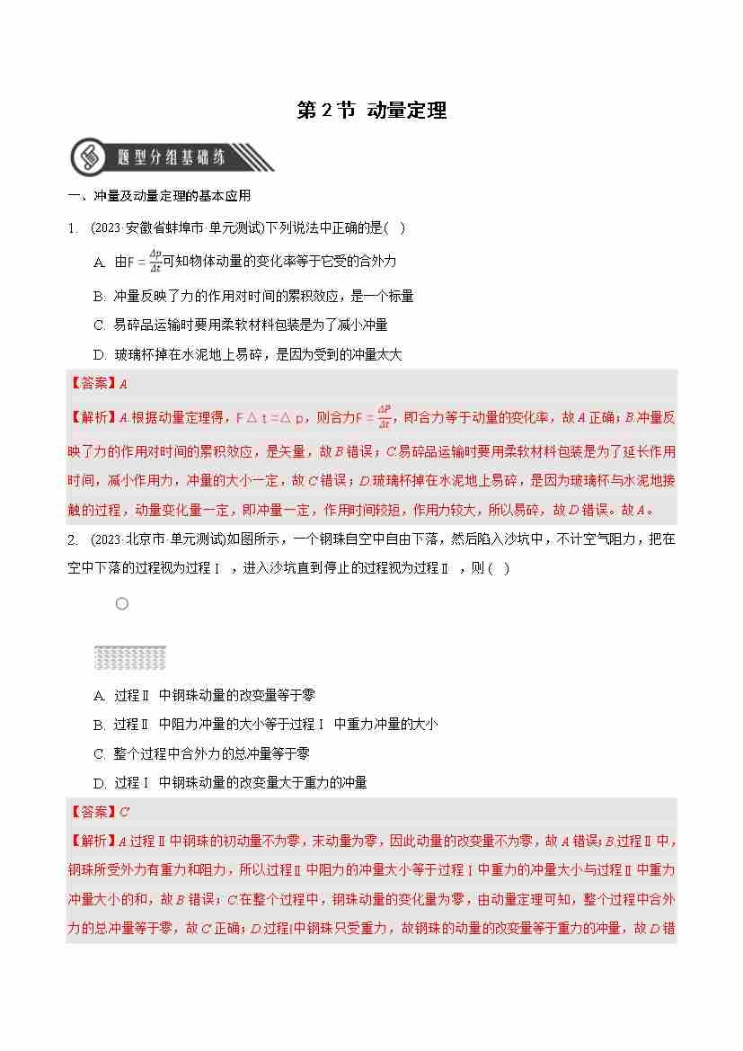 1.2 动量定理(分层作业 )(解析版)(人教版2019选择性必修第一册)