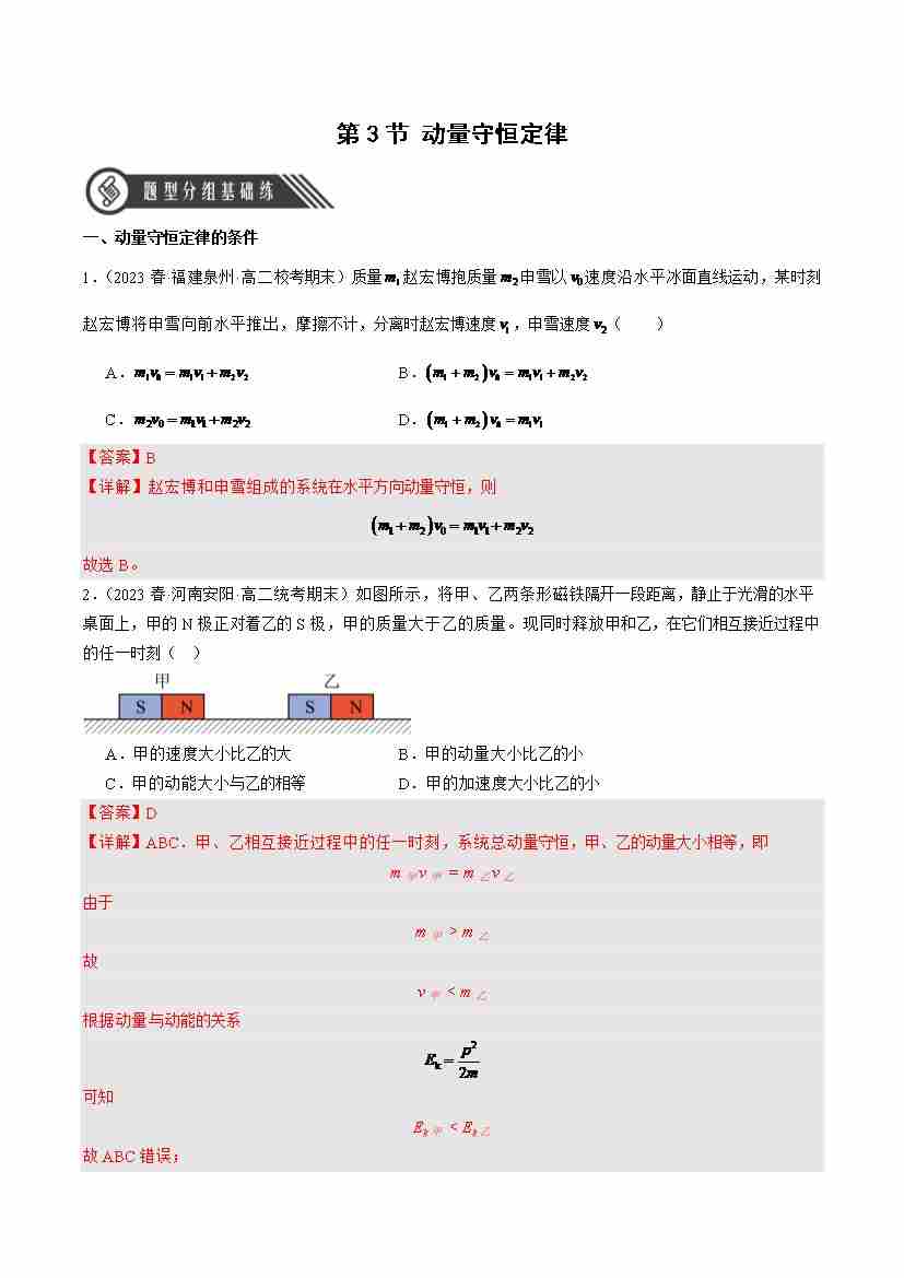 1.3 动量守恒定律(分层作业 )(解析版)(人教版2019选择性必修第一册)