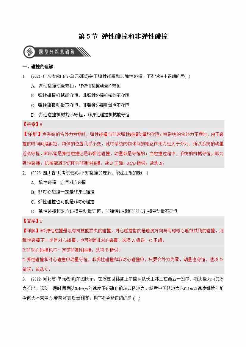 1.5 弹性碰撞和非弹性碰撞(分层作业 )(解析版)-(人教版2019选择性必修第一册)