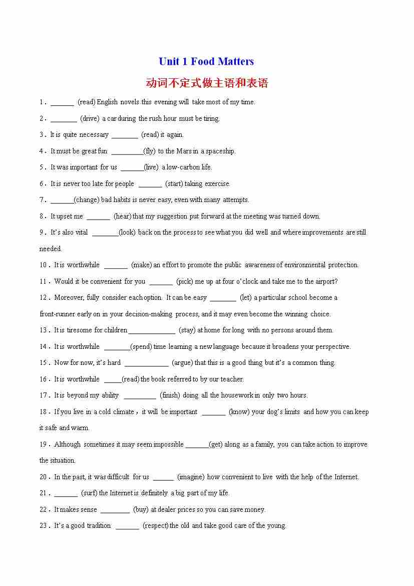 Unit 1 Food Matters 语法Grammar 动词不定式做主语和表语(译林版)