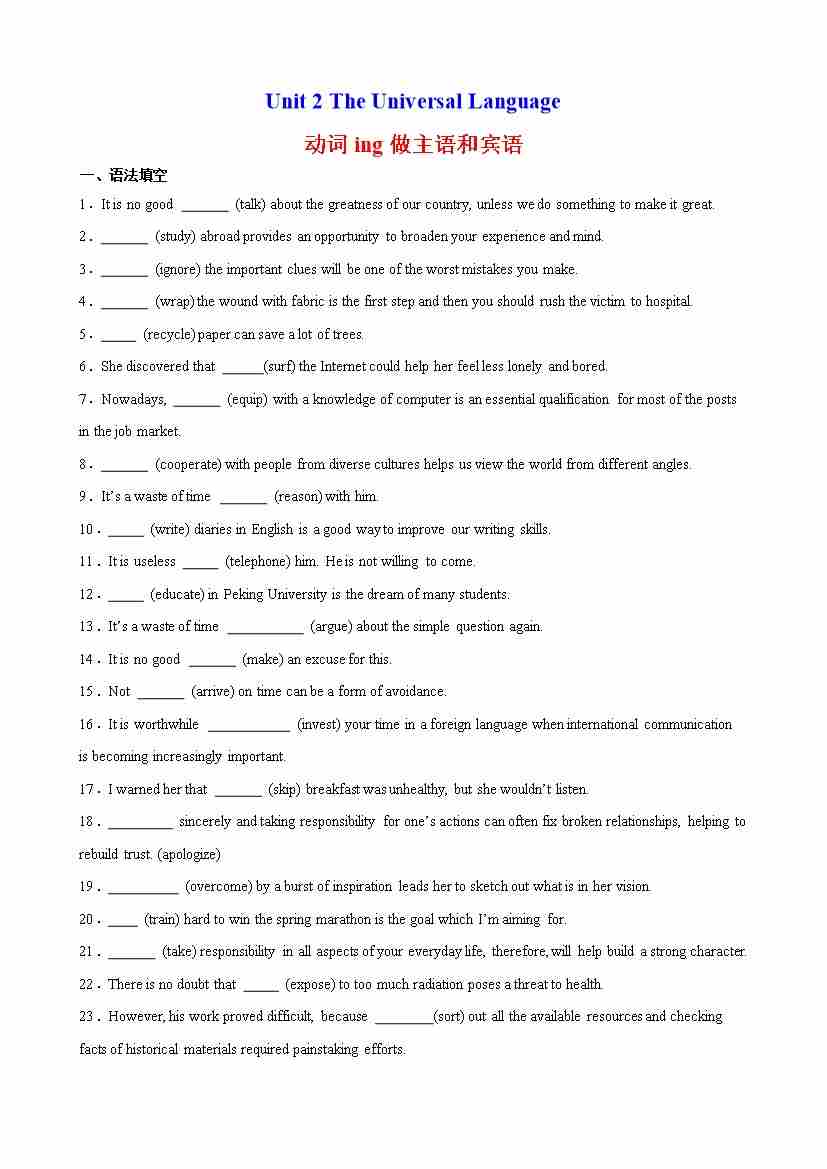 Unit 2 The Universal Language 语法Grammar 动词ing做主语和宾语(原卷版)