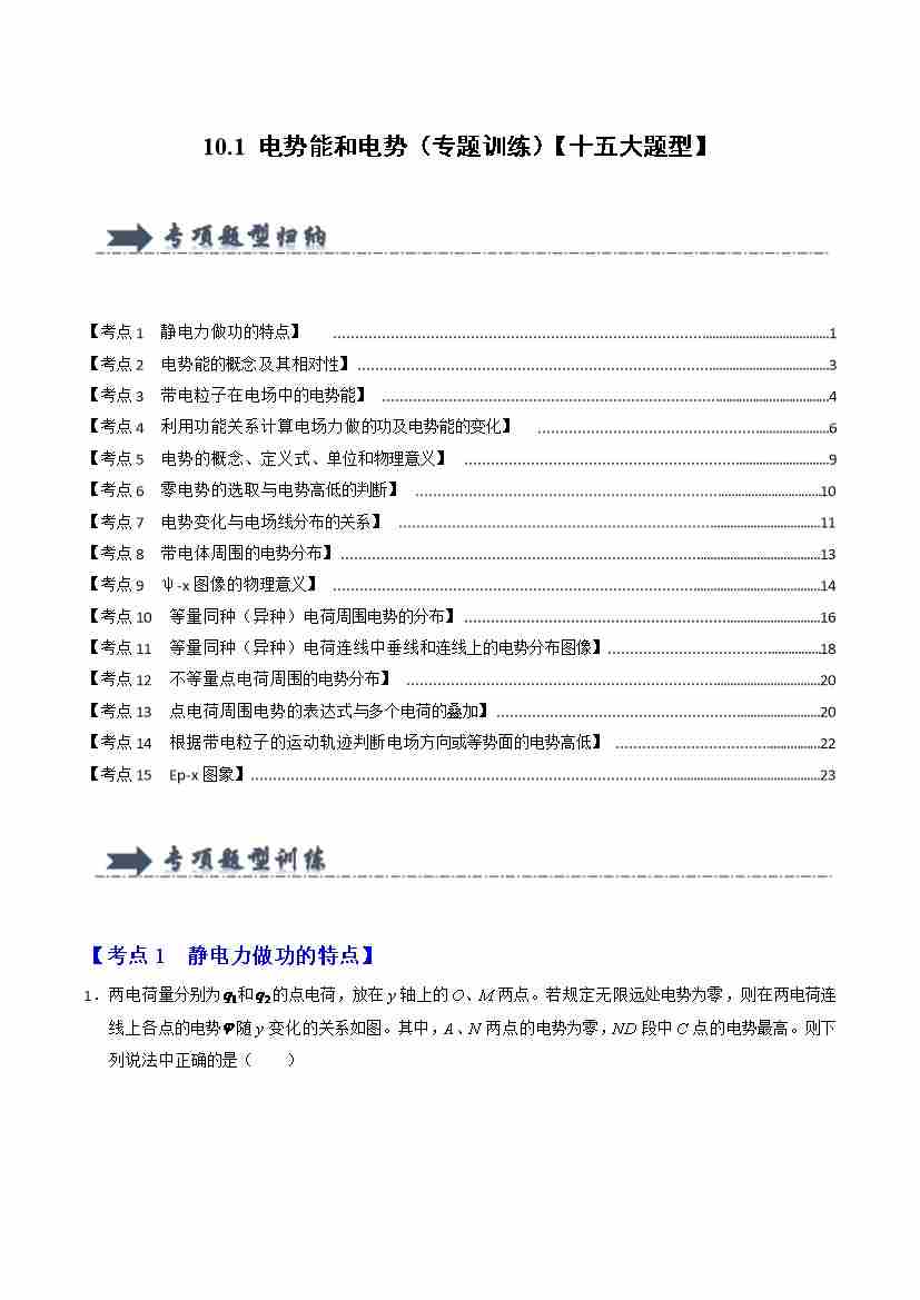 10.1 电势能和电势(专题训练)(十五大题型)(学生版)