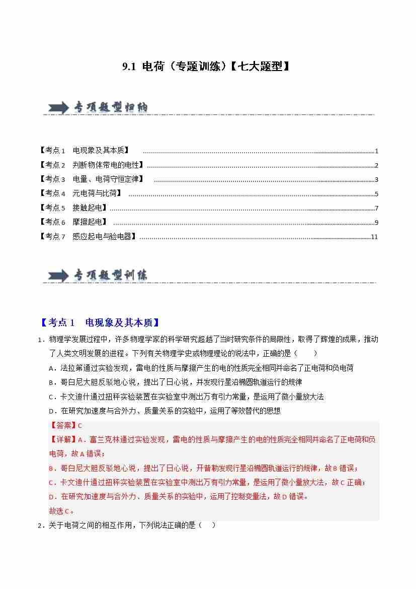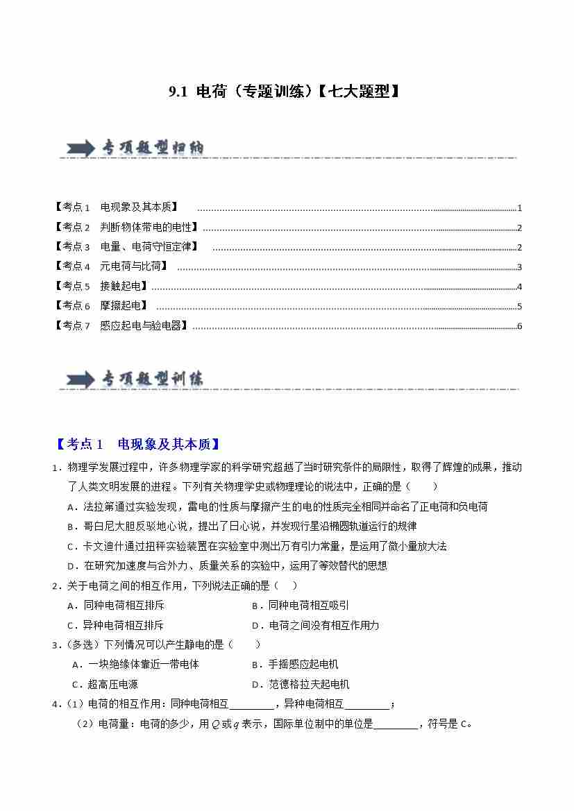 9.1 电荷(专题训练)(七大题型)(学生版)