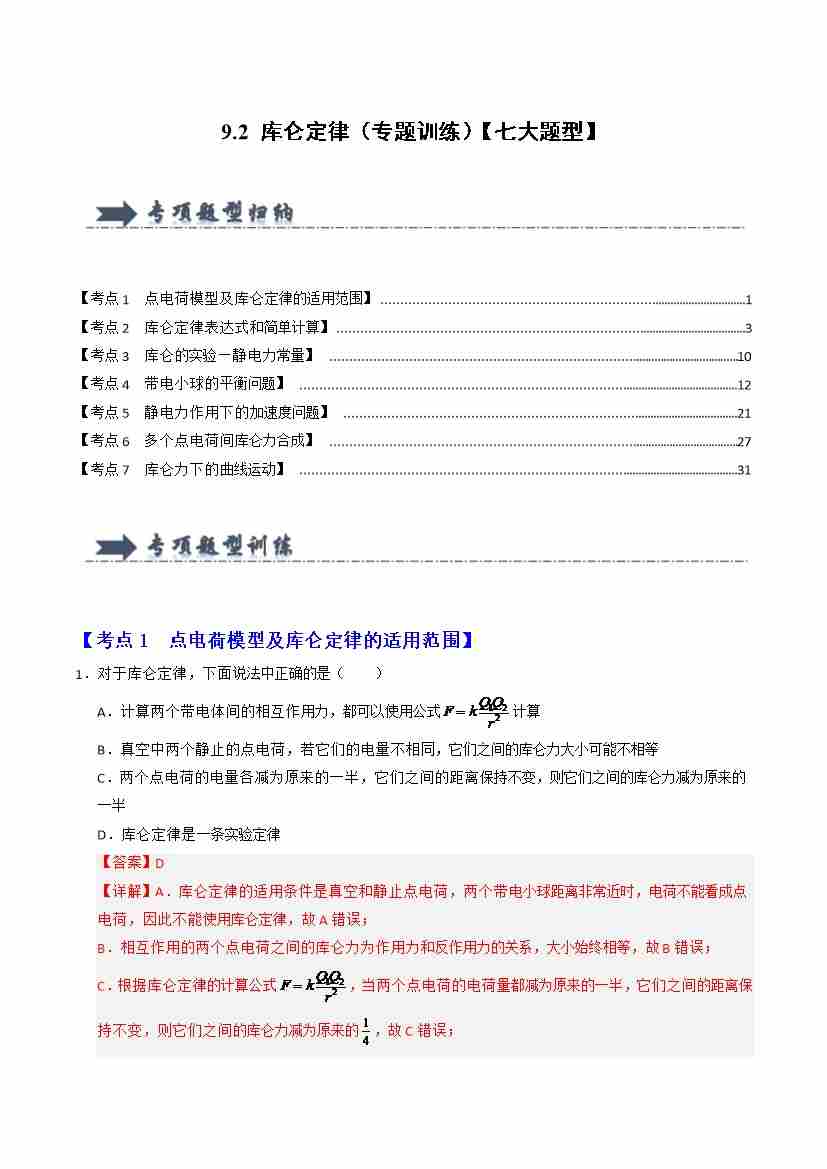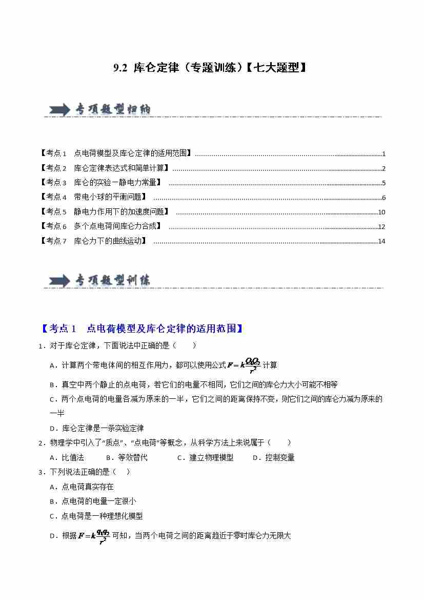 9.2 库仑定律(专题训练)(七大题型)(教师版)
