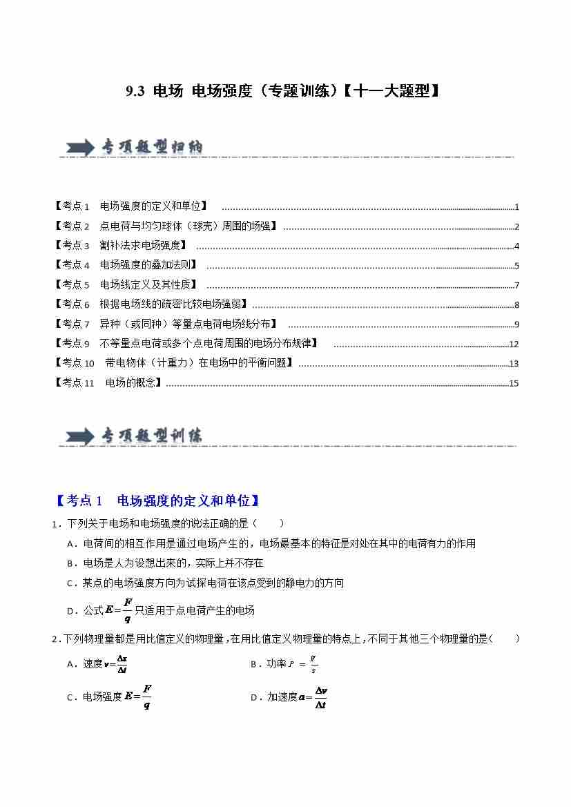 9.3 电场 电场强度(专题训练)(十一大题型)(学生版)