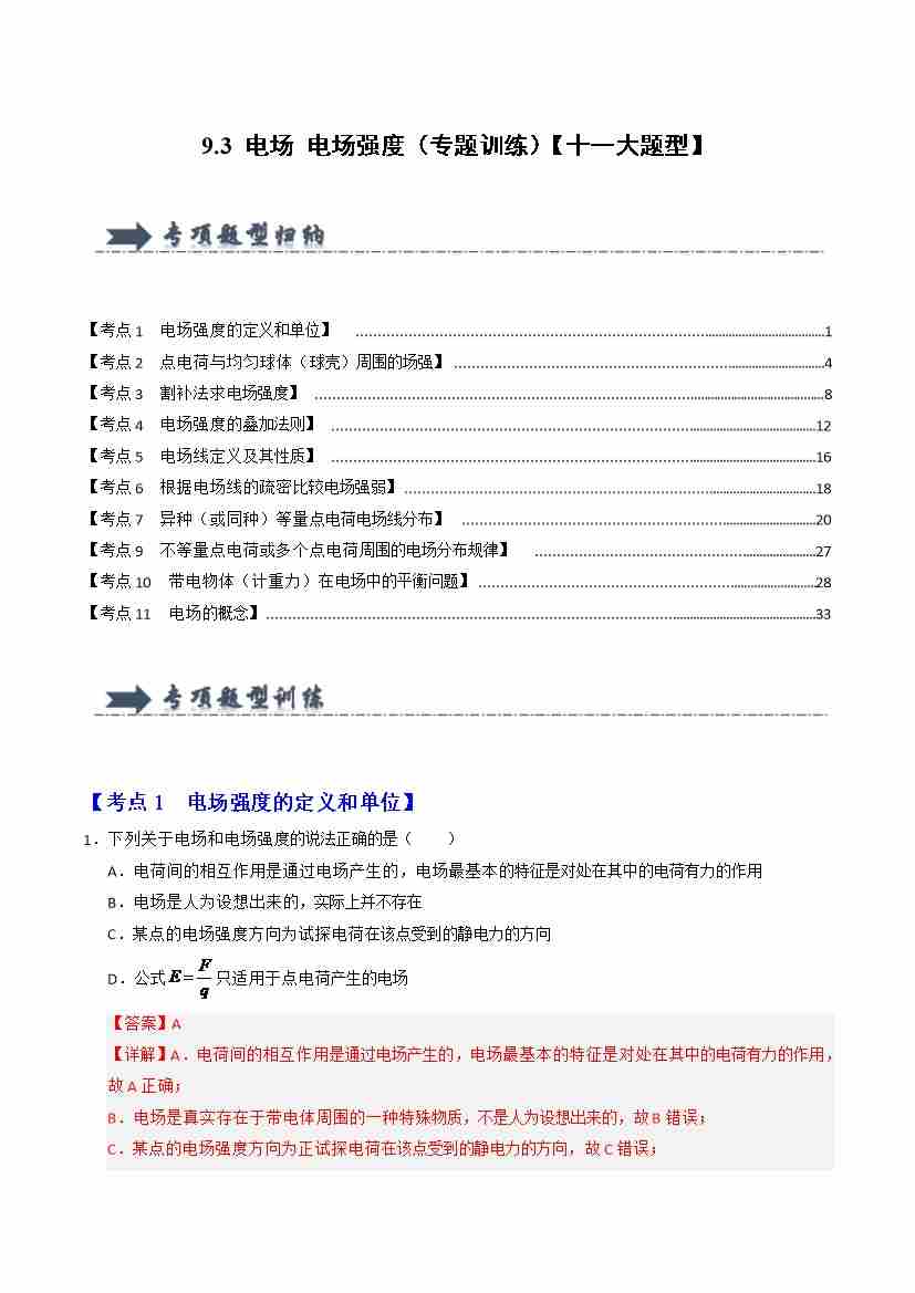 9.3 电场 电场强度(专题训练)(十一大题型)(教师版)