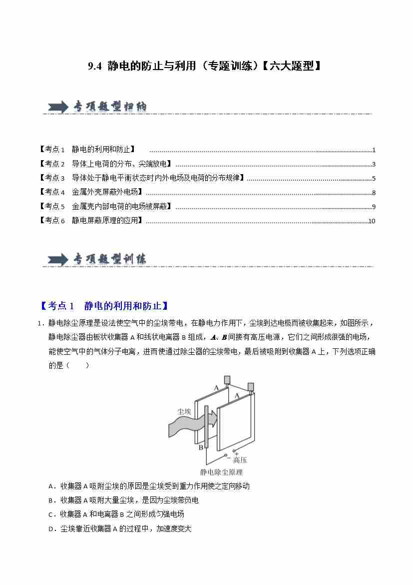 9.4 静电的防止与利用(专题训练)(六大题型)(教师版)