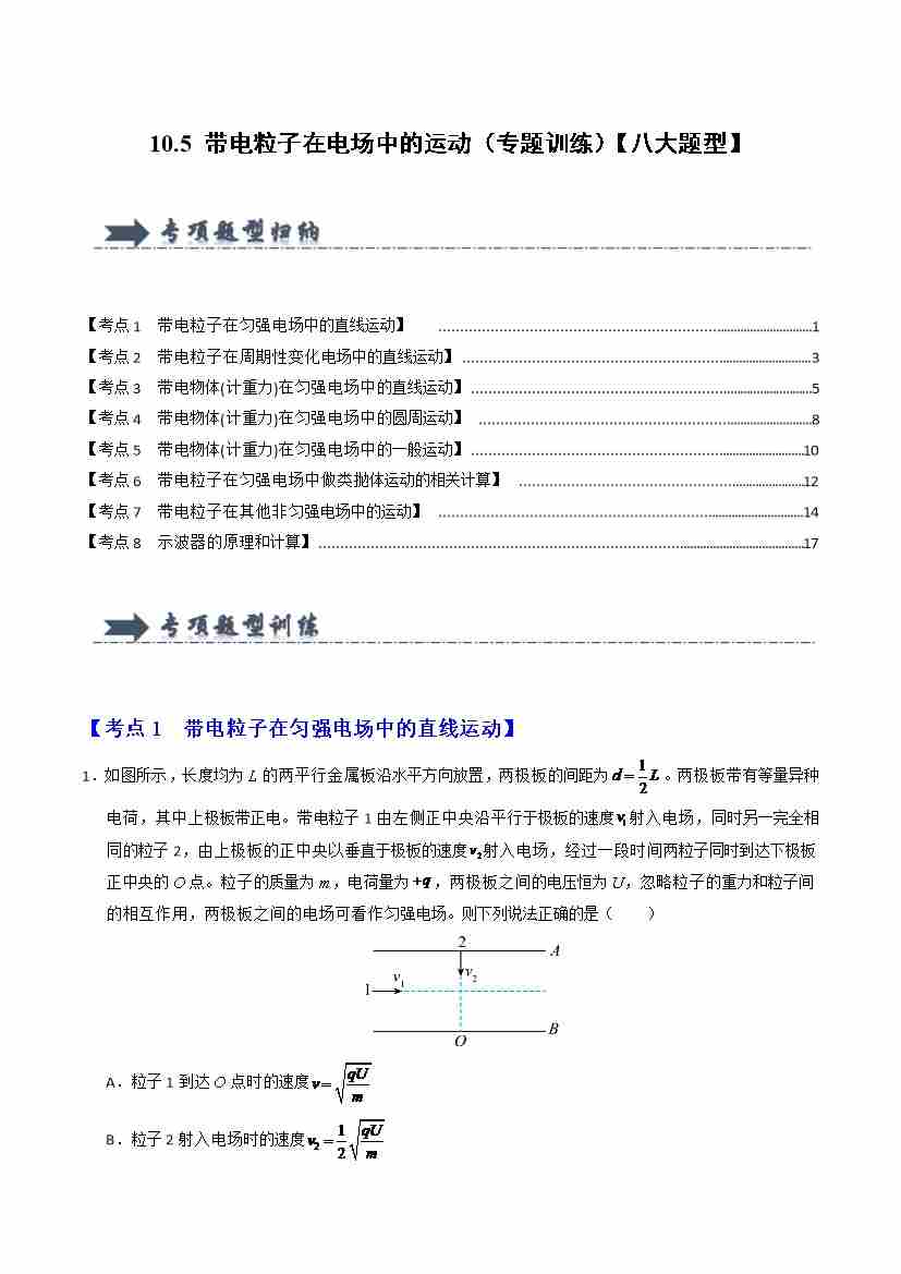 10.5 带电粒子在电场中的运动(专题训练)(八大题型)(学生版)