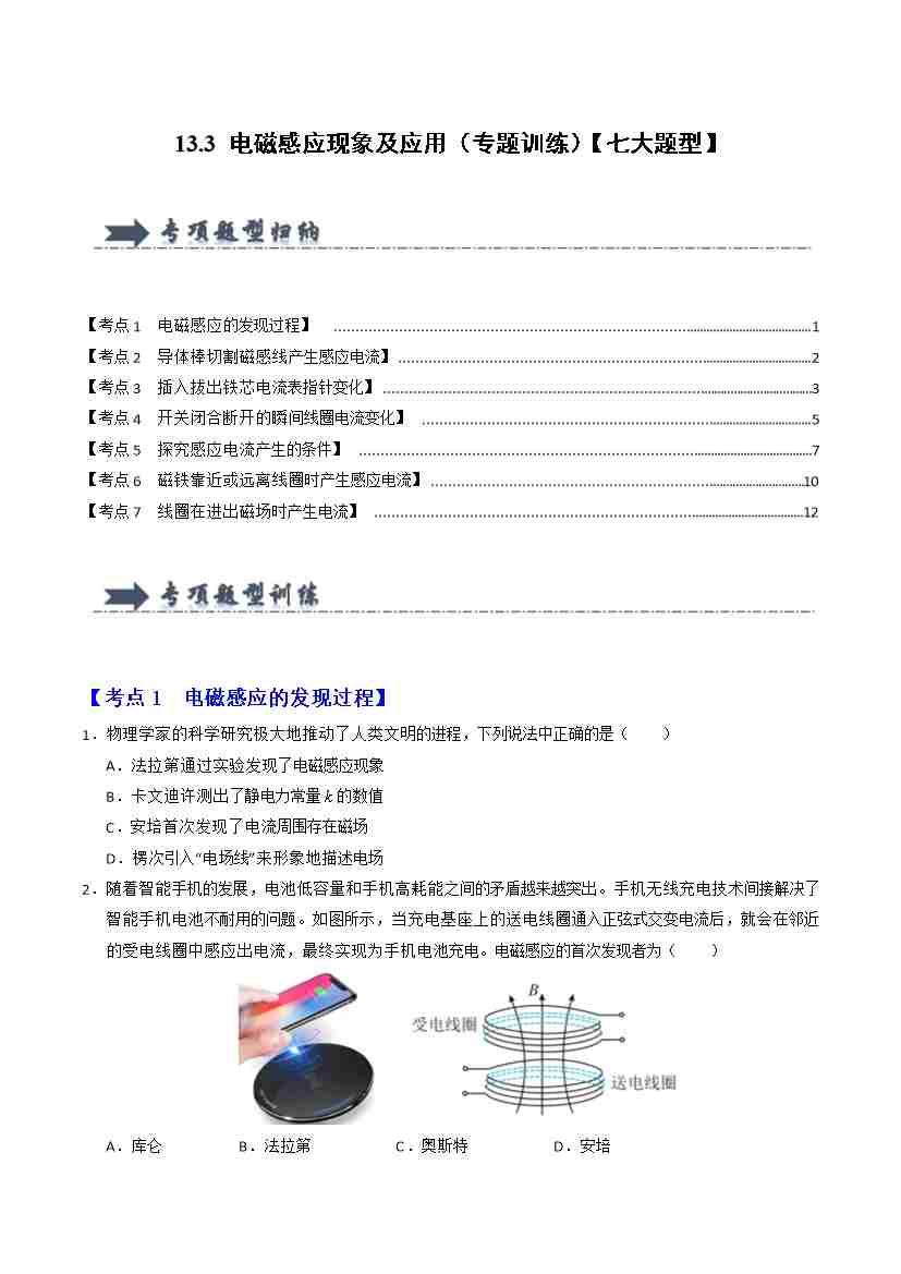 13.3 电磁感应现象及应用(专题训练)(七大题型)(学生版)