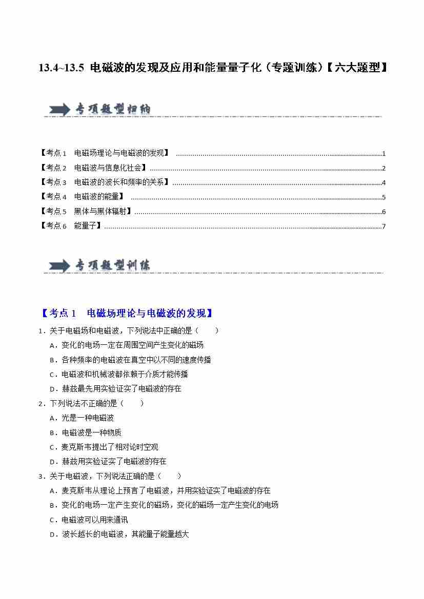 13.4~13.5 电磁波的发现及应用和能量量子化(专题训练)(六大题型)(学生版)