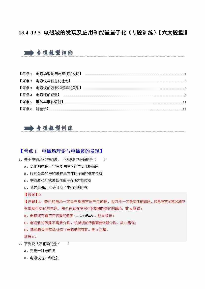 13.4~13.5 电磁波的发现及应用和能量量子化(专题训练)(六大题型)(教师版)