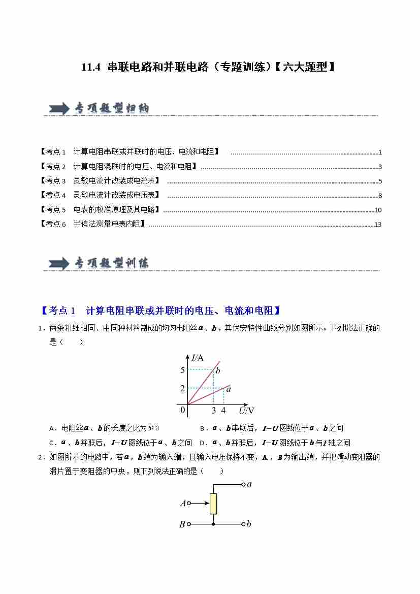 11.4 串联电路和并联电路(专题训练)(六大题型)(学生版)