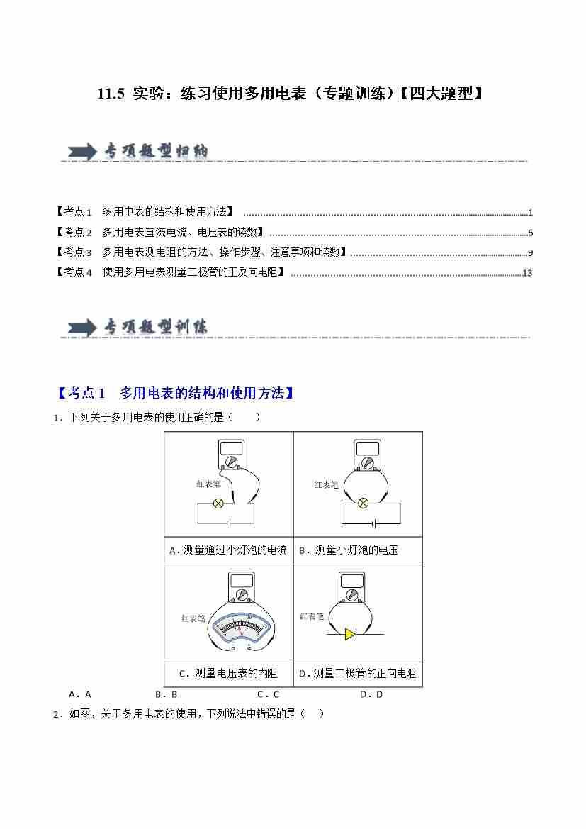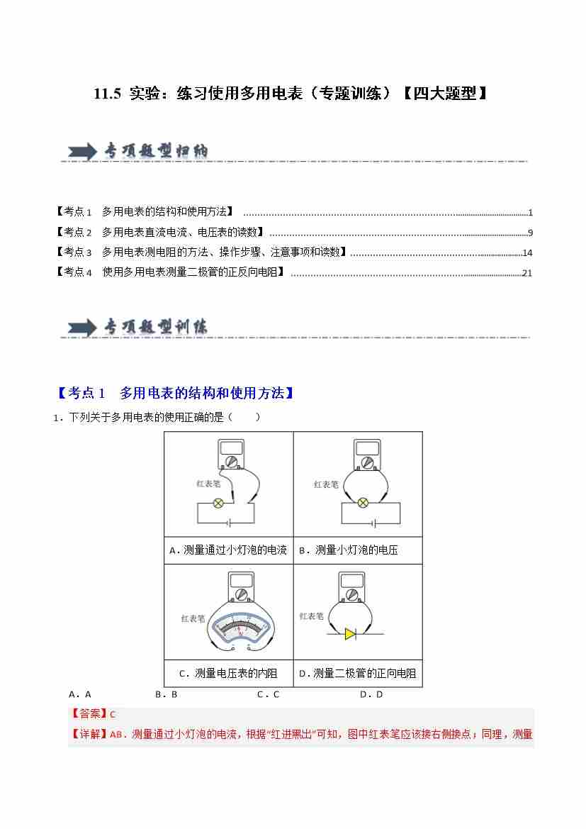 11.5 实验:练习使用多用电表(专题训练)(四大题型)(教师版)