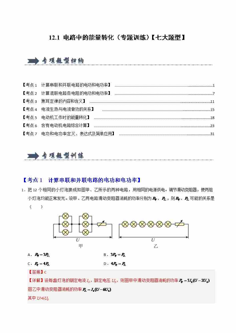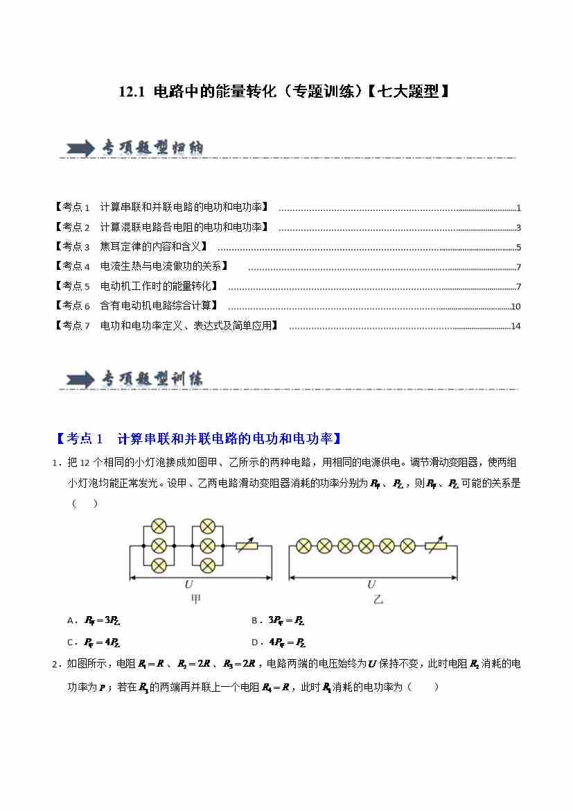 12.1 电路中的能量转化(专题训练)(七大题型)(学生版)