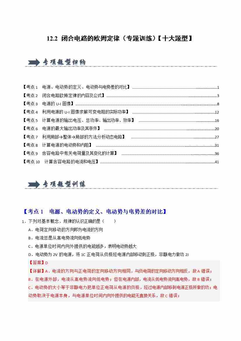 12.2 闭合电路的欧姆定律(专题训练)(十大题型)(学生版)