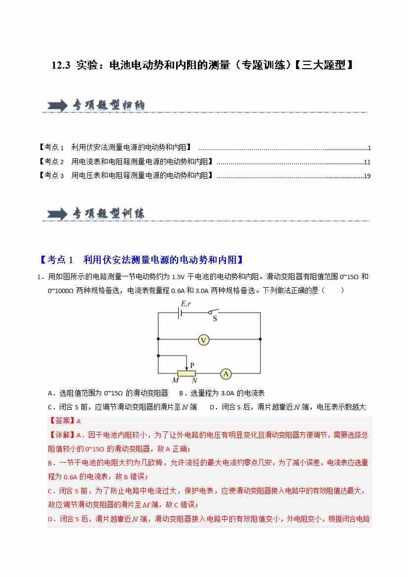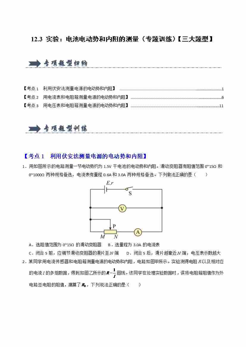 12.3 实验:电池电动势和内阻的测量(专题训练)(三大题型)(学生版)