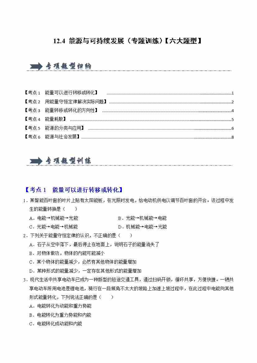12.4 能源与可持续发展(专题训练)(六大题型)(学生版)
