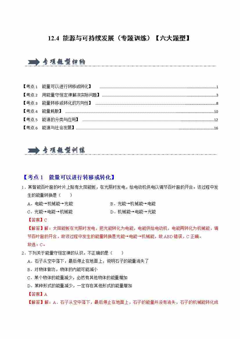 12.4 能源与可持续发展(专题训练)(六大题型)(教师版)