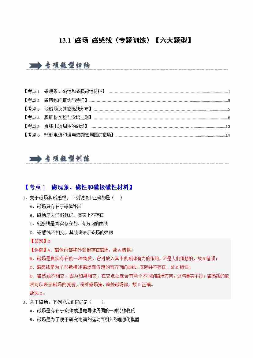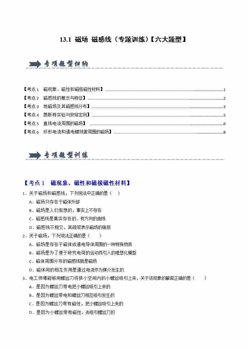 13.1 磁场 磁感线(专题训练)(六大题型)(教师版)