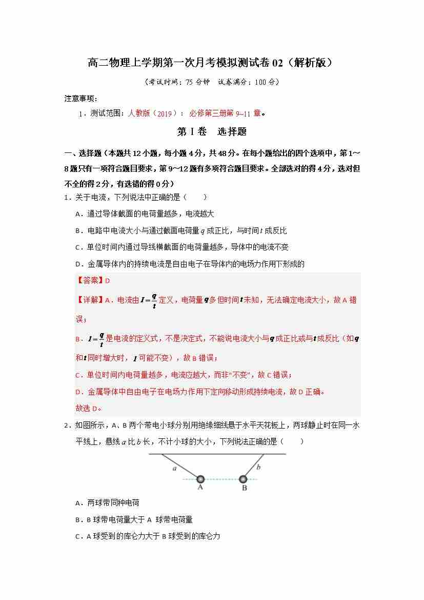 高二物理上学期第一次月考模拟测试卷02(教师版)