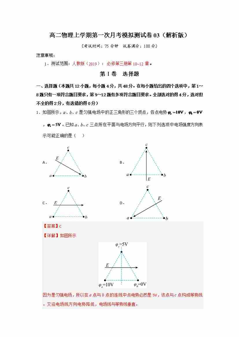 高二物理上学期第一次月考模拟测试卷03(教师版)
