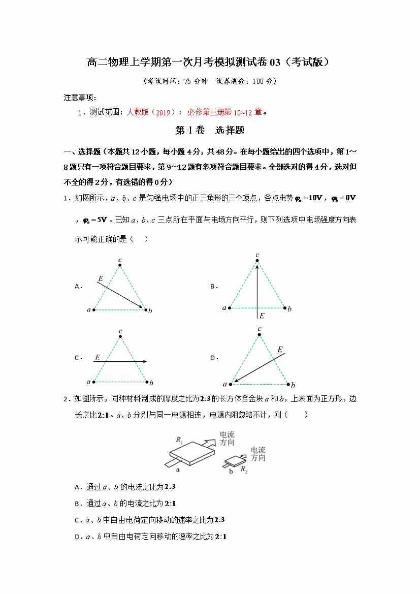 高二物理上学期第一次月考模拟测试卷03(测试范围:人教版2019必修第三册,第10~12章)(考试版)