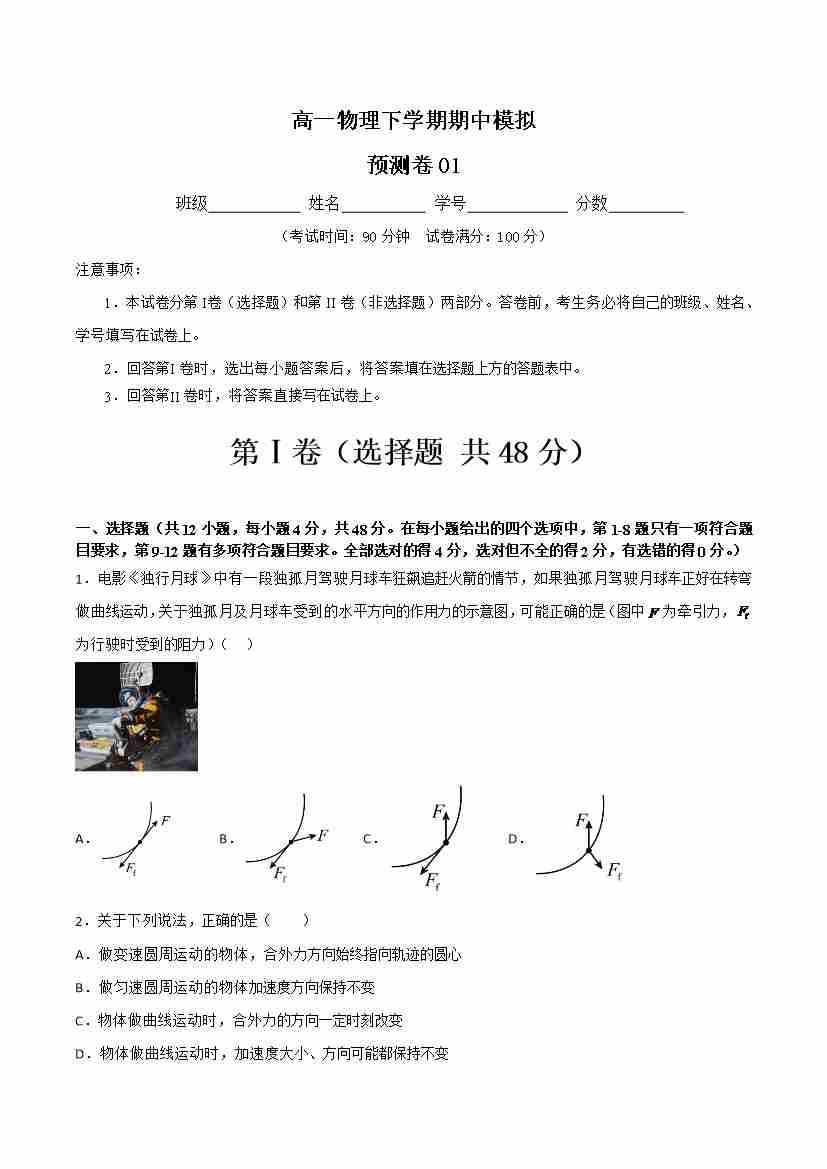 期中模拟预测卷01-高一物理下学期期中(人教版2019)(学生版)
