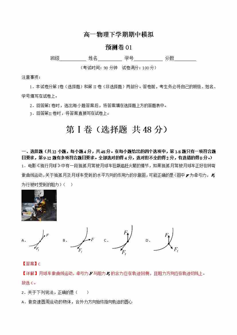 期中模拟预测卷01-高一物理下学期期中(人教版2019)(教师版)