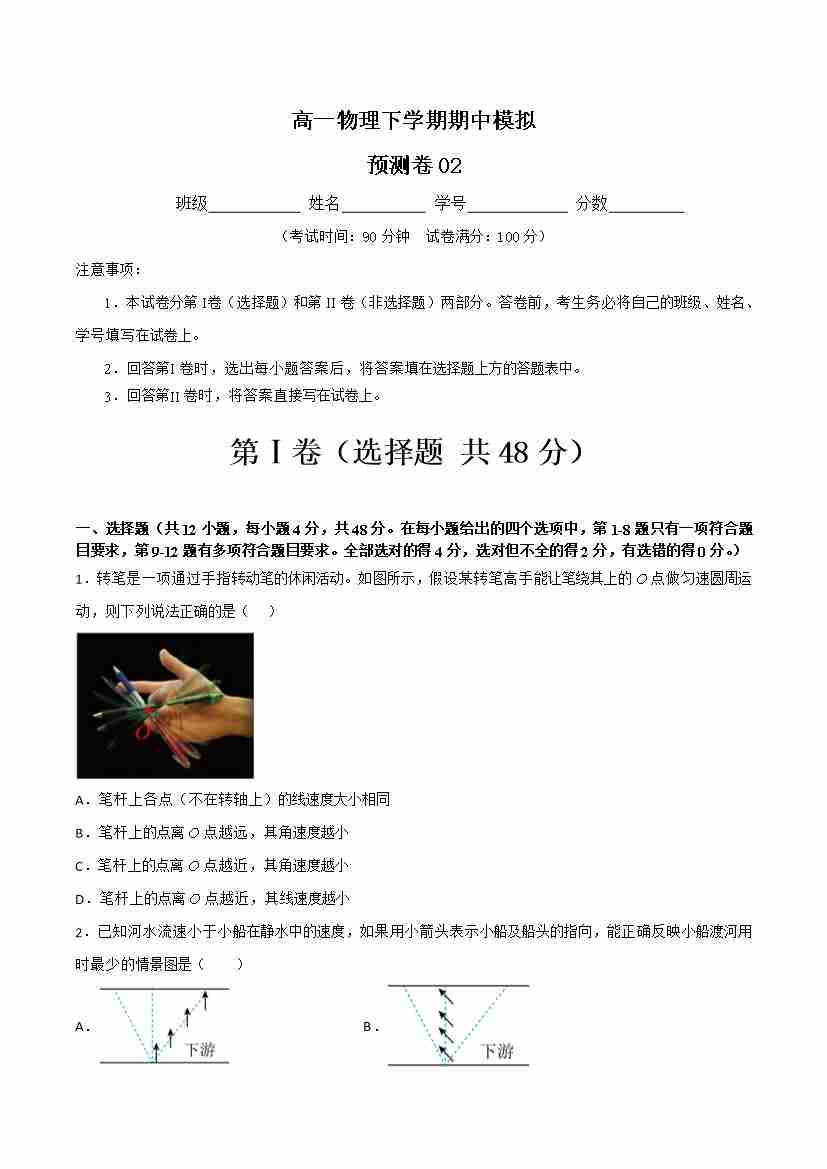 期中模拟预测卷02-高一物理下学期期中(人教版2019)(学生版)