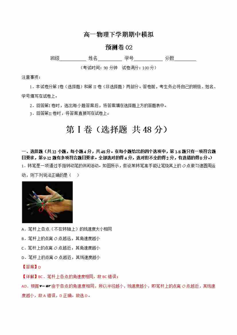 期中模拟预测卷02-高一物理下学期期中(人教版2019)(教师版)
