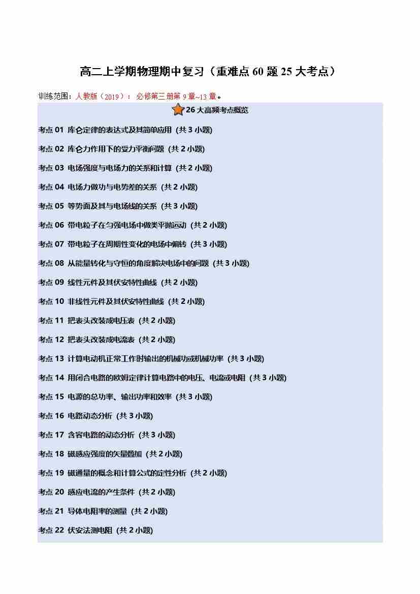 高二上学期物理期中复习(重难点60题25大考点)(学生版)
