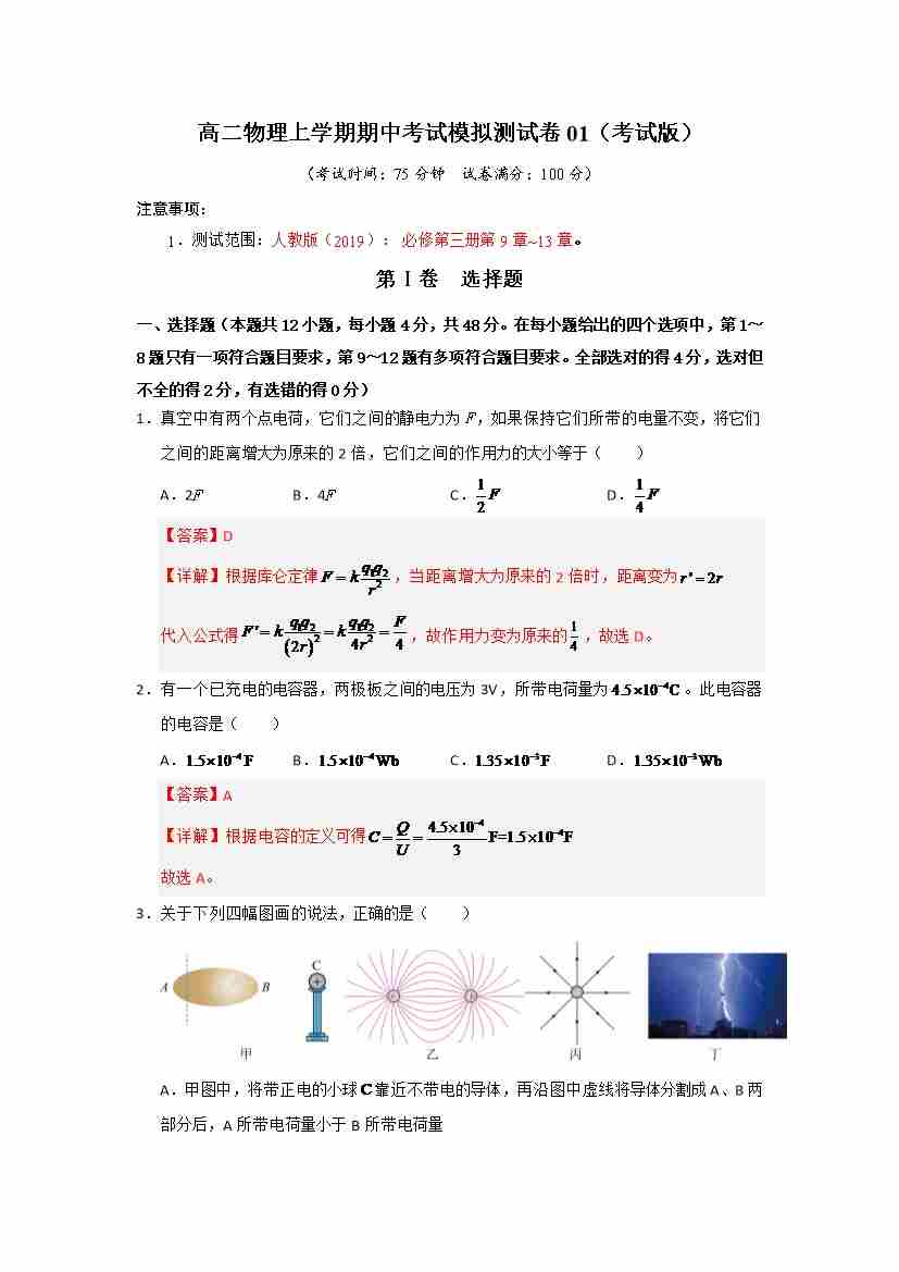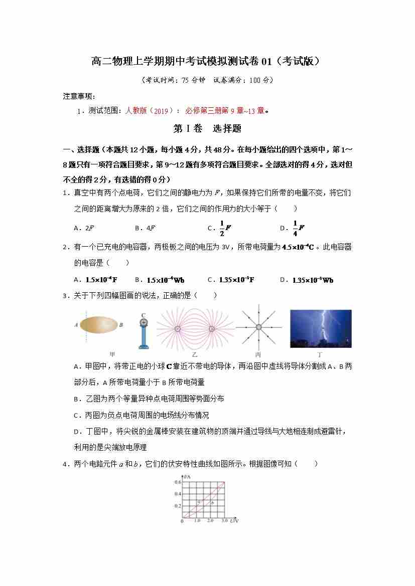 高二物理上学期期中考试模拟测试卷01(测试范围:人教版2019必修第三册,第9~13章)(考试版)