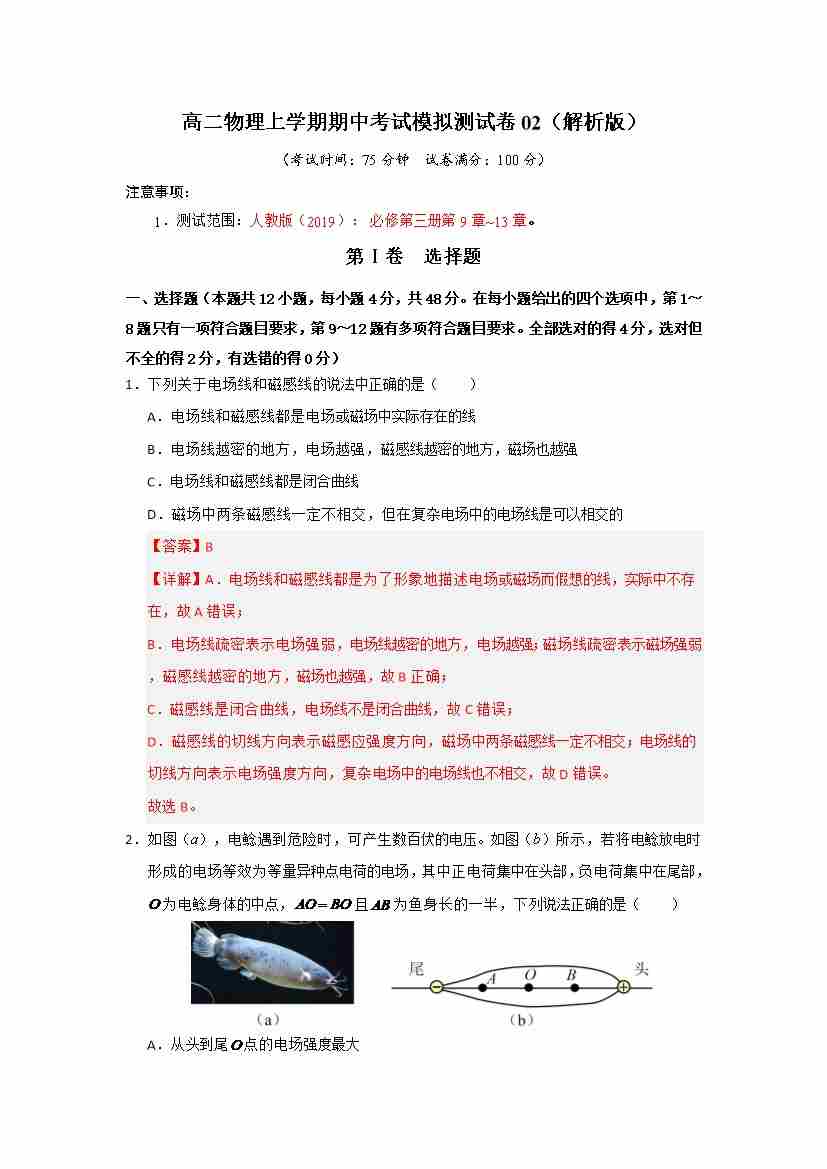 高二物理上学期期中考试模拟测试卷02(教师版)