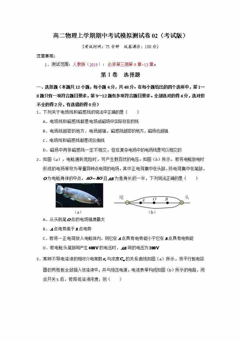 高二物理上学期期中考试模拟测试卷02(测试范围:人教版2019必修第三册,第9~13章)(考试版)