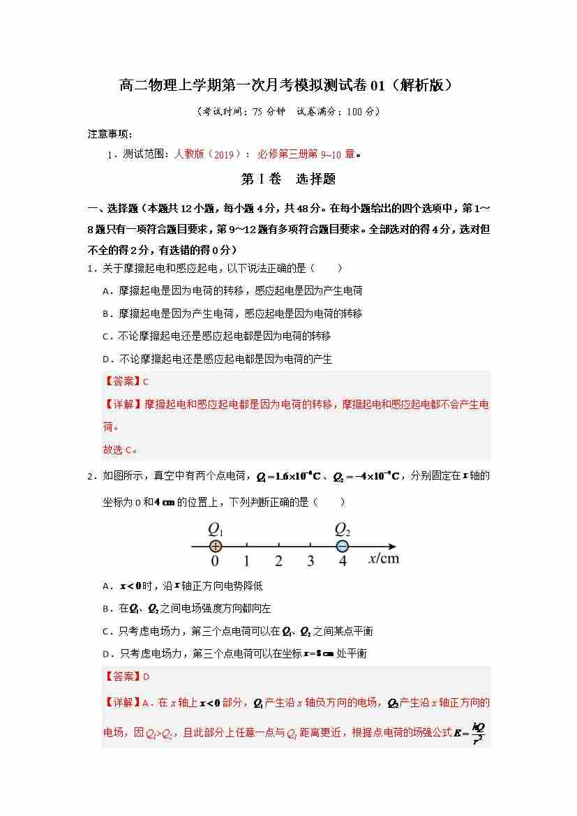 高二物理上学期第一次月考模拟测试卷01(教师版)