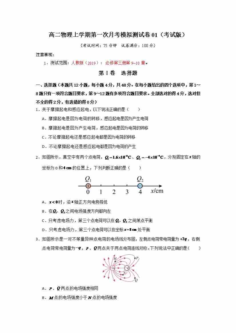 高二物理上学期第一次月考模拟测试卷01(测试范围:人教版2019必修第三册,第9~10章)(考试版)