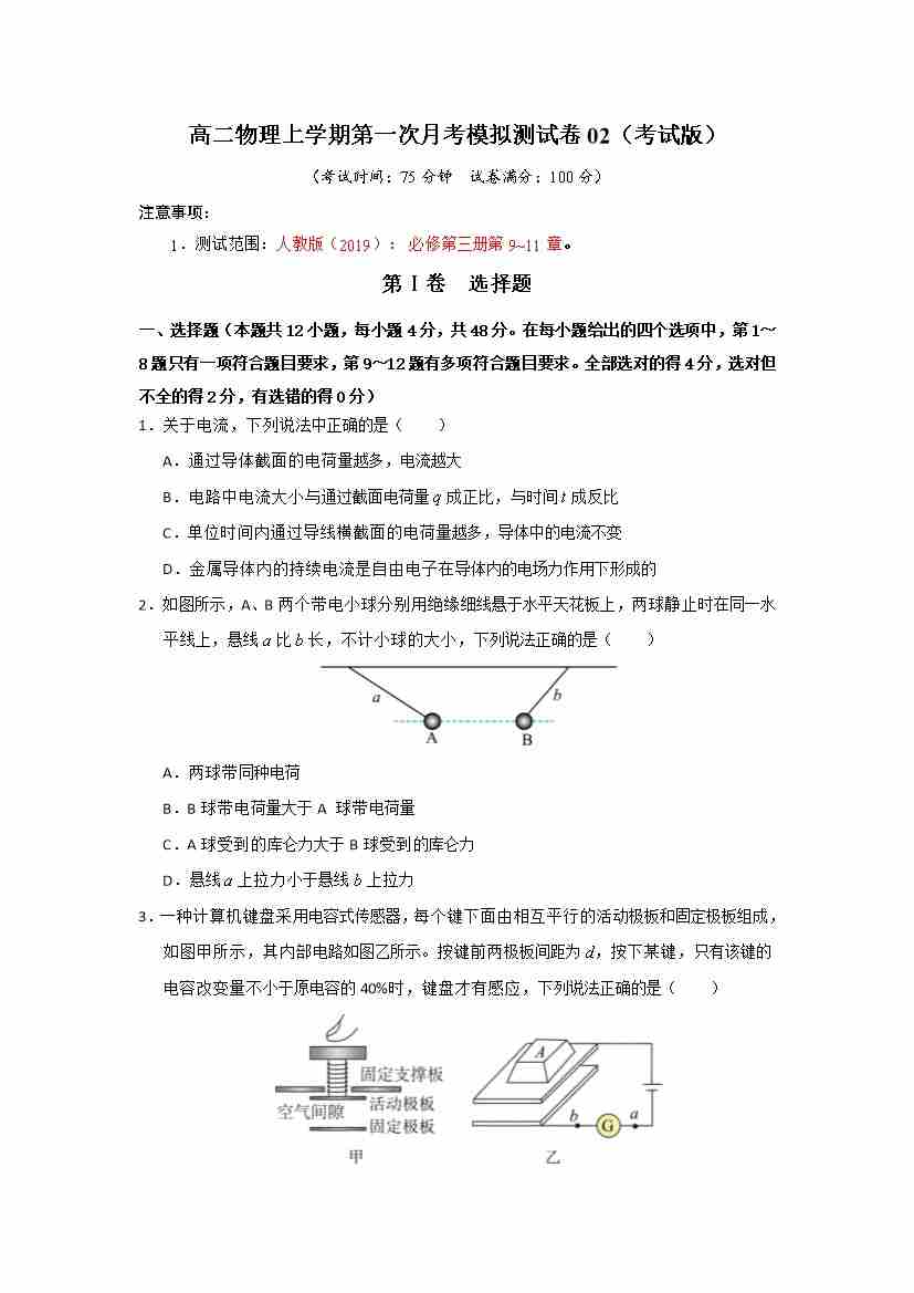 高二物理上学期第一次月考模拟测试卷02(测试范围:人教版2019必修第三册,第9~11章)(考试版)