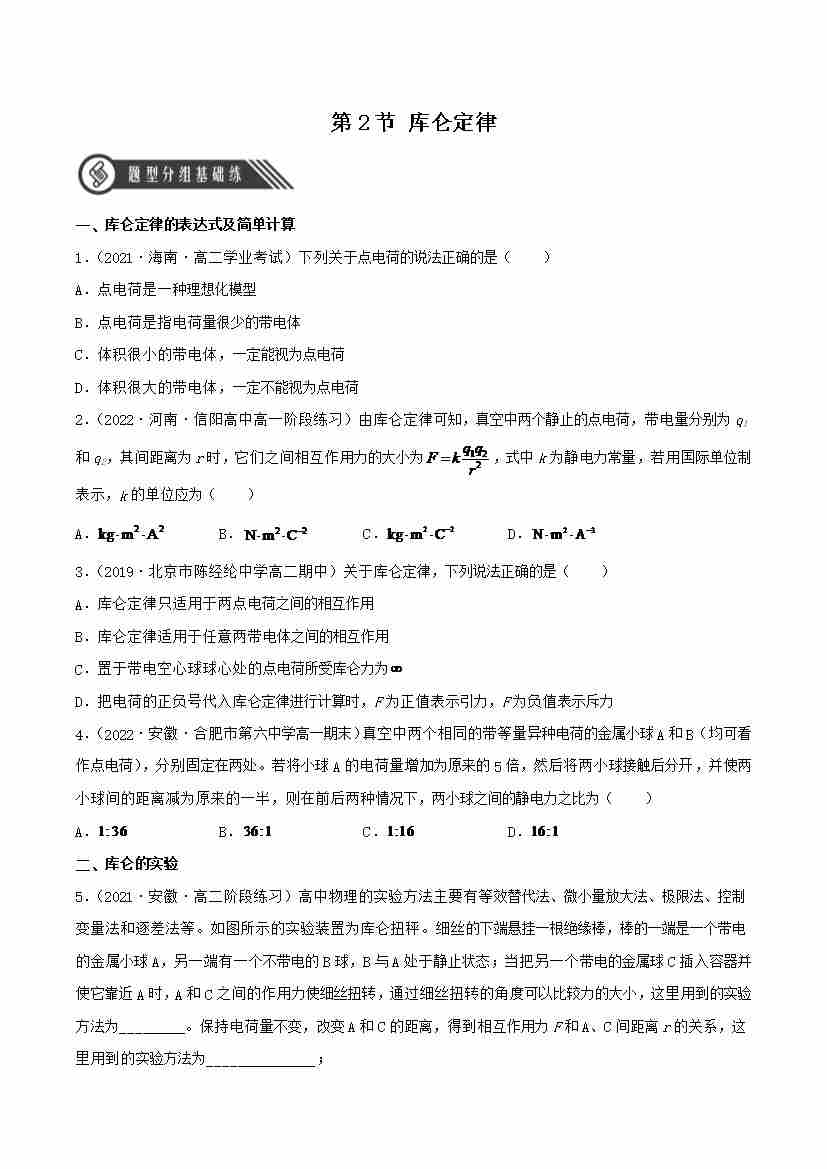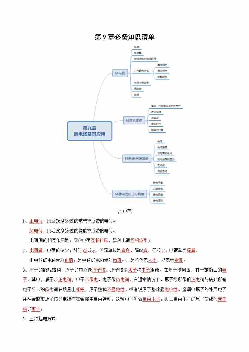 第9章+静电场及其应用(单元知识清单)(单元知识清单)(原卷版)