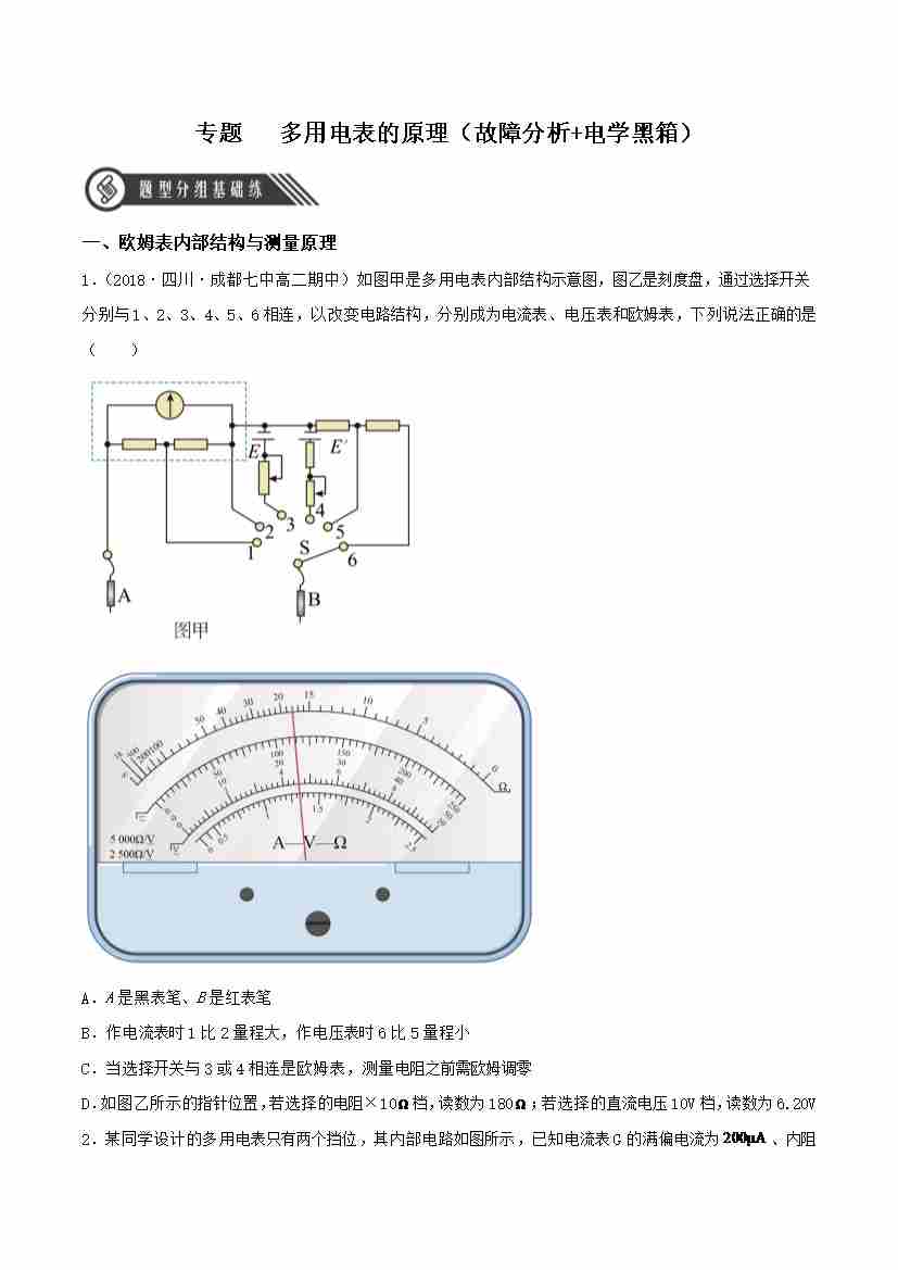 专题 多用电表的原理(故障分析与电学黑箱)(分层作业)(原卷版)