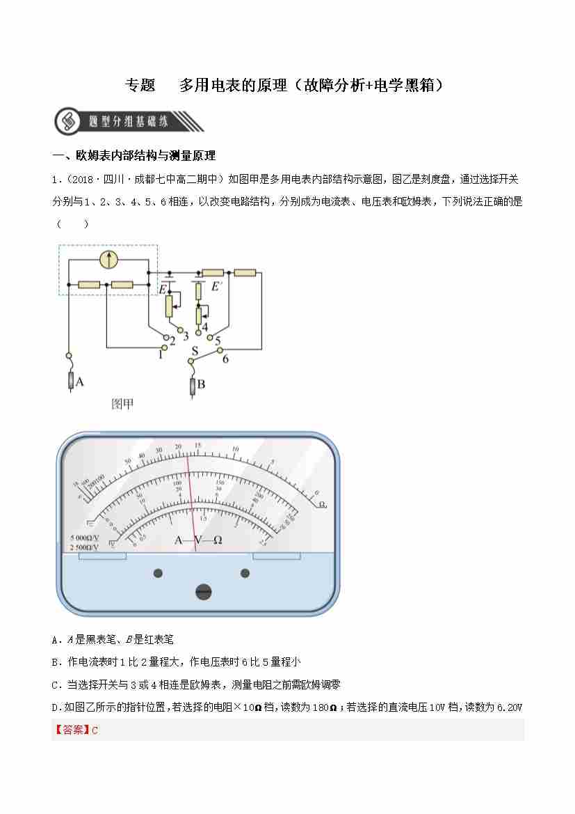 专题 多用电表的原理(故障分析与电学黑箱)(分层作业)(解析版)