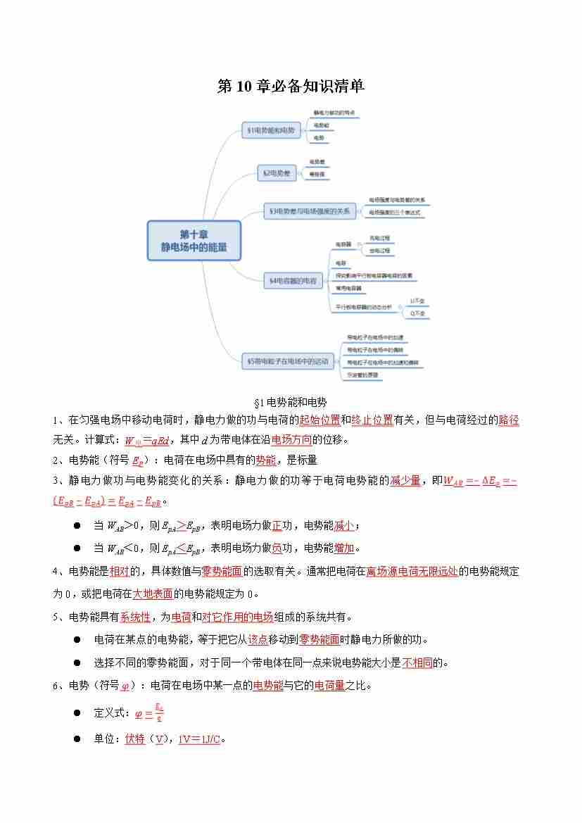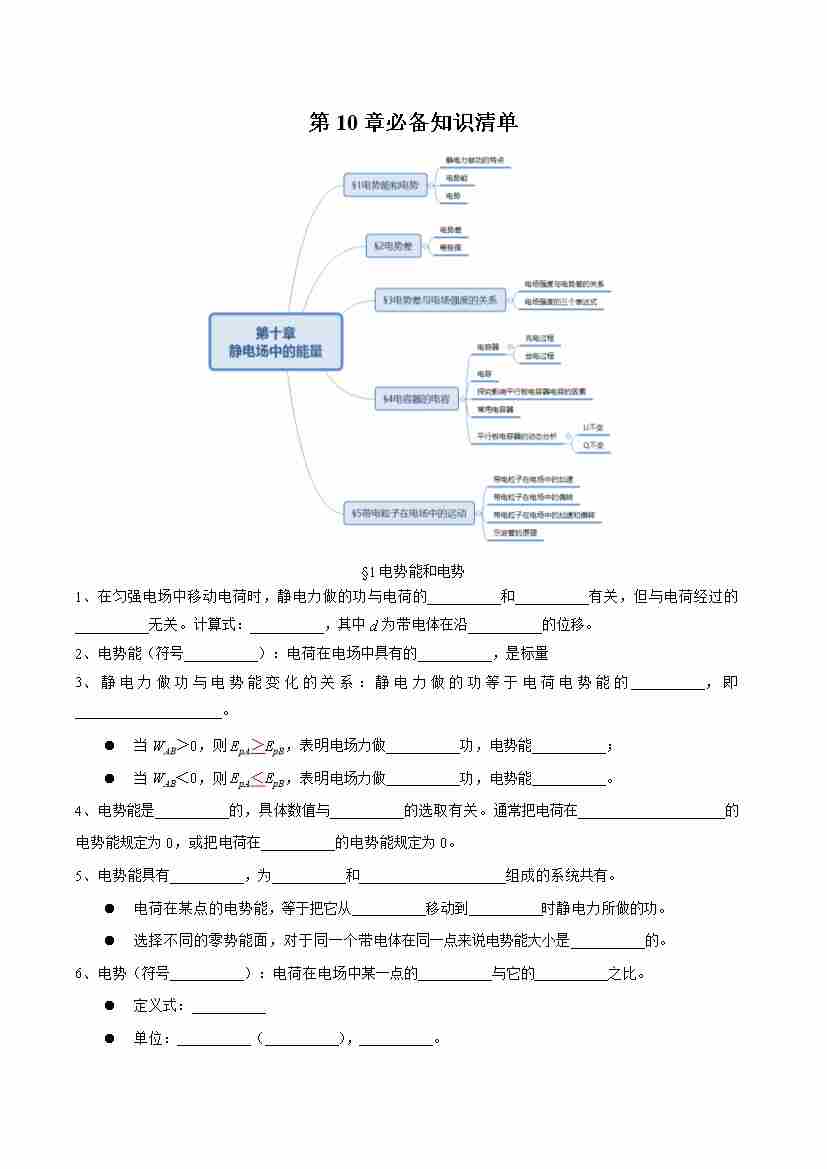 第10章 静电场中的能量(单元知识清单)(原卷版)- (人教版2019必修第三册)