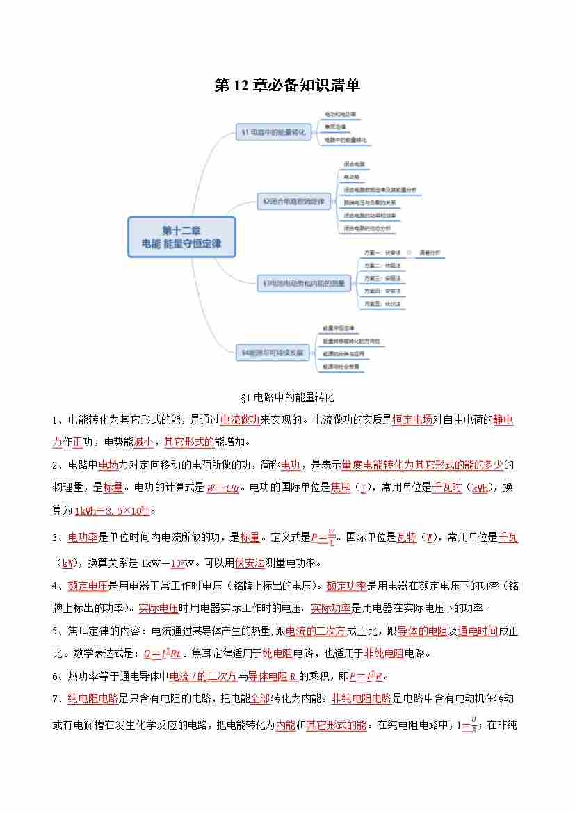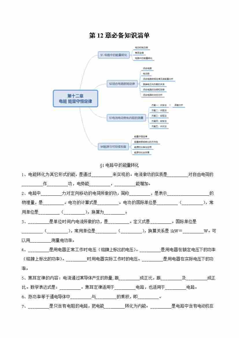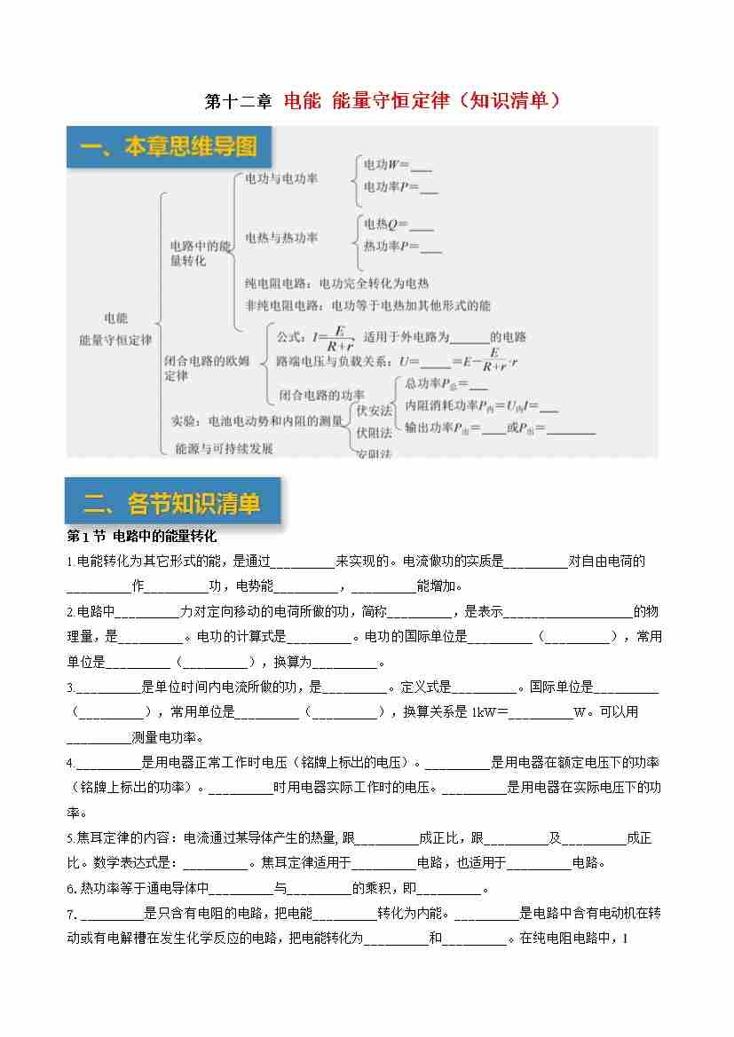 第十二章 电能 能量守恒定律(知识清单)(挖空版)