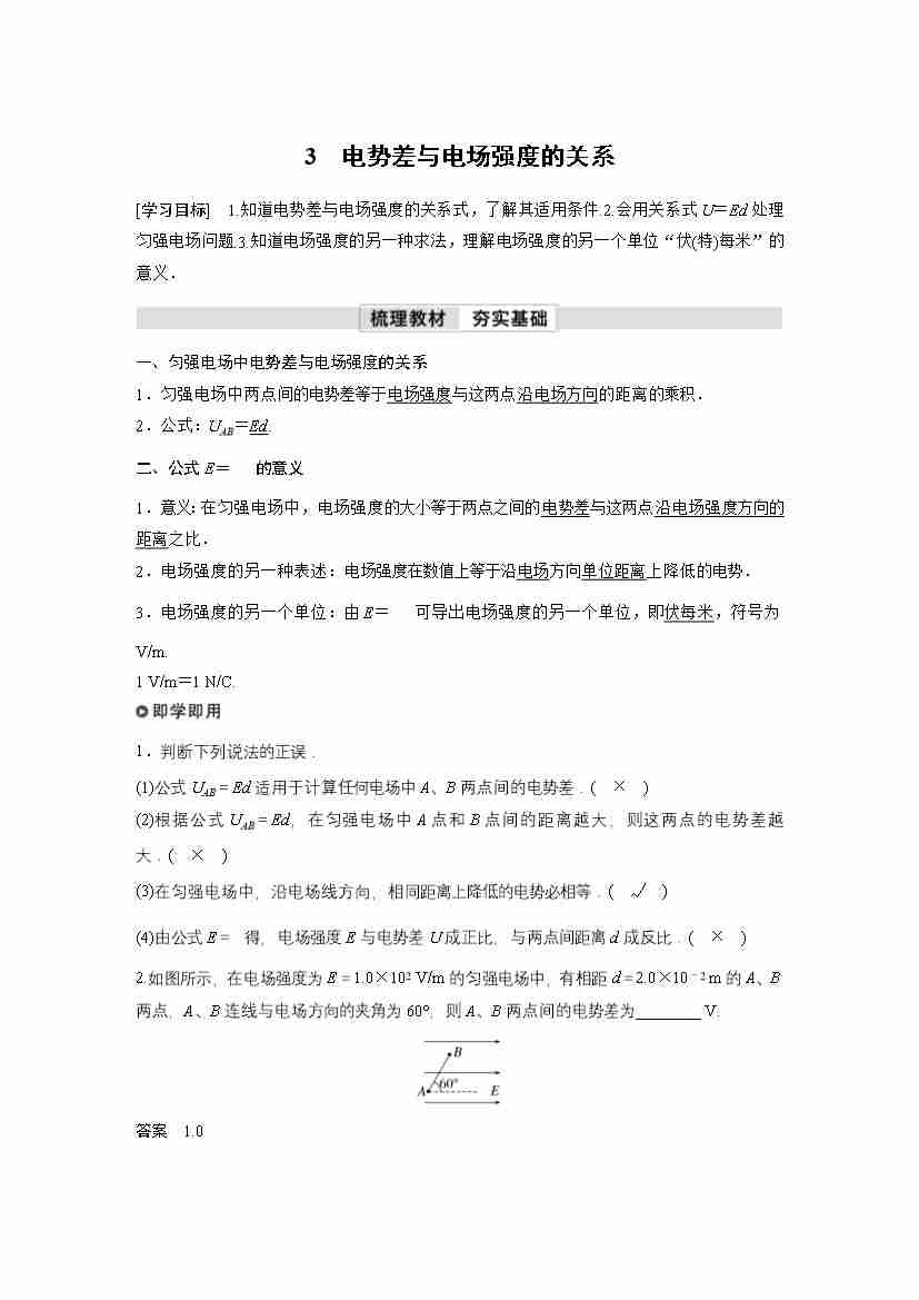 高中物理新教材同步 必修第三册 第10章 3 电势差与电场强度的关系